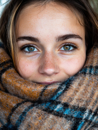 Close-up of a woman wrapped in a warm scarf.