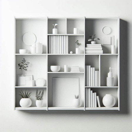White bookshelves with decorative elements. 3d render illustration.