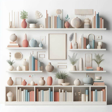3d rendered bookshelves with books and decorations on the wall