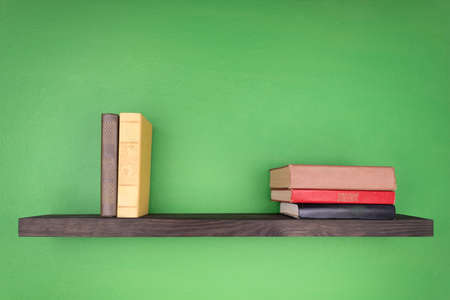 on the zen background there is a black shelf with the texture of a tree. Three books from the left lie on the right. two books stand vertically