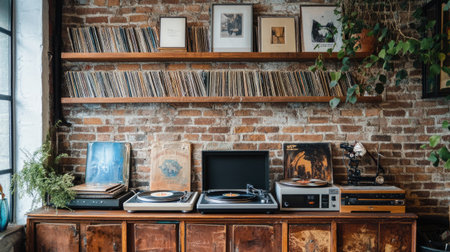A record player and a collection of vinyl records displayed artistically on a brick wall shelf