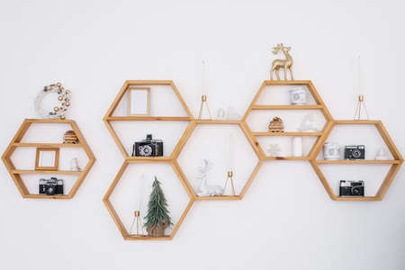 Pine wood hexagonal shelves on the wall with a variety of Christmas decorations.