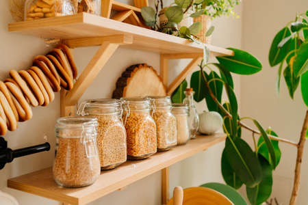 glass jars on a wooden shelf. convenient storage in the kitchen.