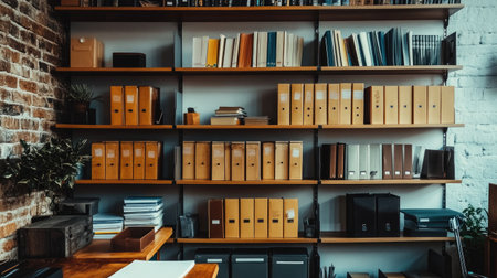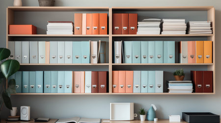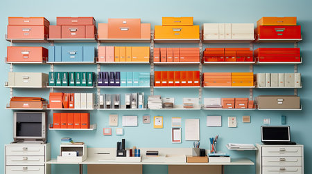 A well-stocked wall of shelves with office folders and essentials, representing effortless organization in a modern office