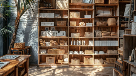 A cozy interior scene featuring wooden storage shelves filled with woven baskets, books, and decorative home items, bathed in soft sunlight.
