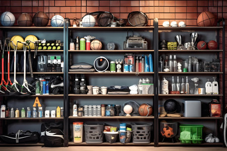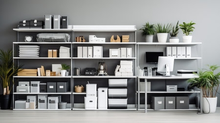 array of steel shelves, with black and white accessories for clean, modern look, created with generative ai