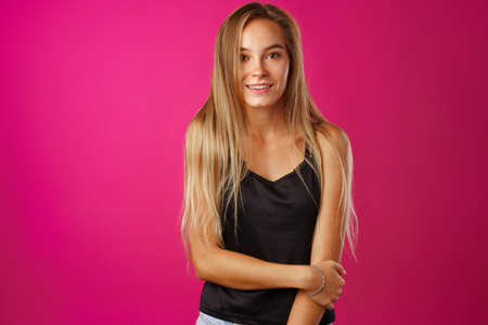 Portrait of a beautiful young woman or teenage girl posing against a pink background. Copy space.