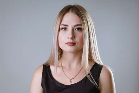 A girl with short hair stands against a dark gray wall, portrait of a blonde, a sexy woman.