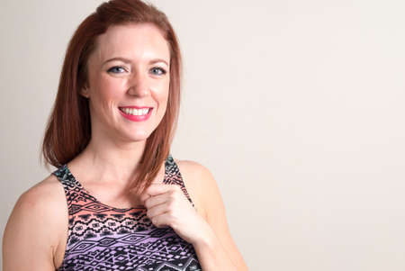 Portrait of beautiful cheerful redhead girl with curly hair over beige background. Hair dyed with henna. Professional hair care.
