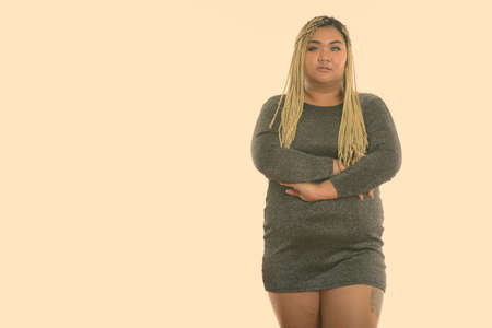 Studio shot of young fat Asian woman thinking while wearing sexy costume