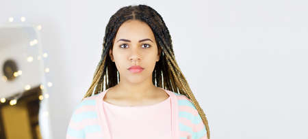 woman of african appearance in white t-shirt fashionable hairstyle posing pink background