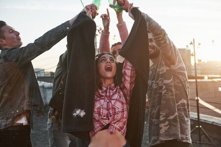 Its to high for the girl. All about the party and having good time. Young people on the rooftop have celebration.