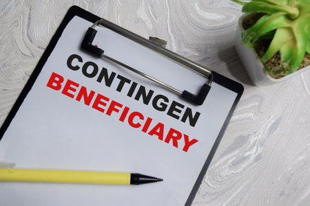 Concept of contingen beneficiary write on clipboard isolated on Wooden Table.