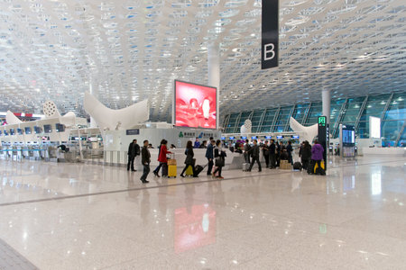 SHENZHEN, CHINA - FEBRUARY 16, 2015: inside of Shenzhen Bao'an International Airport. It is located near Huangtian and Fuyong villages in Bao'an District, Shenzhen, Guangdong, China.