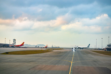 HONG KONG - MARCH 08, 2016: view from Hong Kong International Airport terminal. Hong Kong International Airport is the main airport in Hong Kong