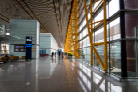 Airport departure terminal with passengers - blurred abstract photo