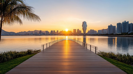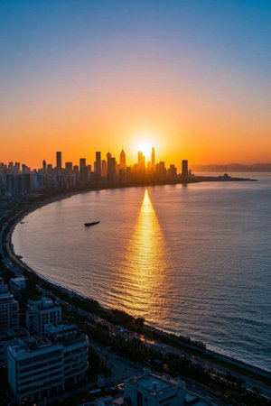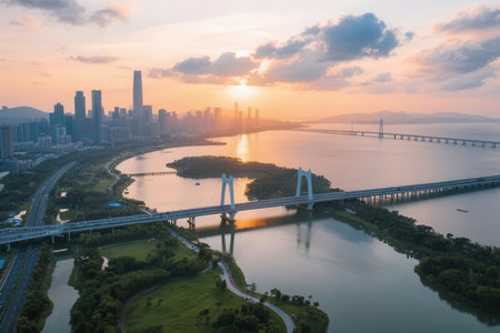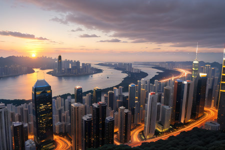 A stunning cityscape showcasing modern skyscrapers and river at sunset
