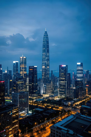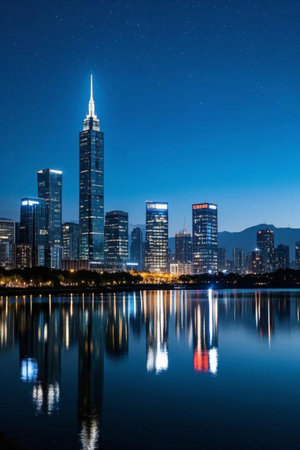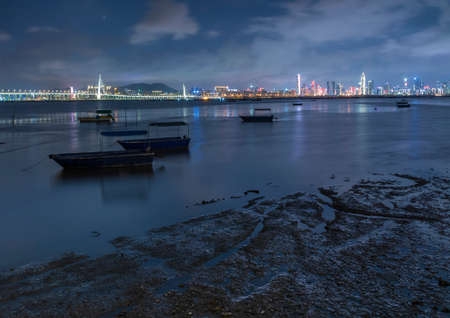 Skyline of Shenzhen city, China at night. Viewed from Hong Kong border Lau Fau Shan