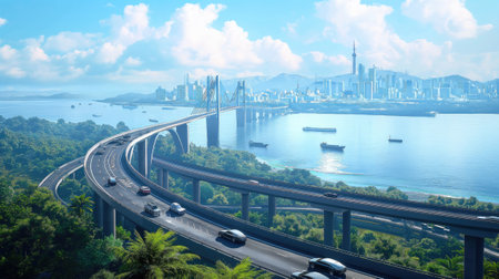 cars traverse elevated bridges against the picturesque backdrop of the Chinese seaside, offering a glimpse into the dynamic urban landscape