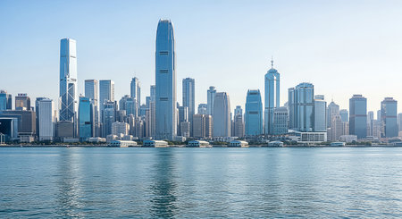 A panoramic view of the Hong Kong skyline, showcasing modern skyscrapers against a clear blue sky. The calm water reflects the city's architecture, creating a serene atmosphere. The composition emphasizes the scale and density of the urban landscape.