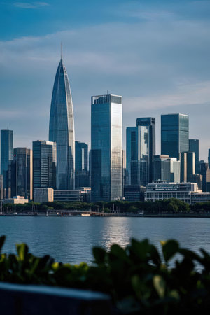 Urban architecture meets natural beauty as a modern skyscraper stands tall by the riverside, creating a picturesque scene of modernity and tranquility.