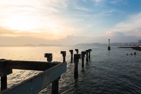 View of Santos from the pier destroyed by a hangover in Ponta da Praia, Brazil.