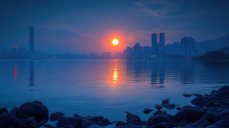 A stunning urban panorama with a citys skyscrapers reflected in a body of water, creating a mesmerizing mirror effect, Twilight sky at Han River in Seoul city, South Korea, AI Generated