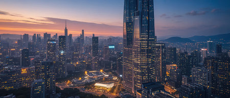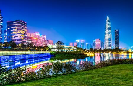 Shenzhen, China - July 16, 2018: Shenzhen urban cityscape of new city modern downtown area at blue hour in Guangdong China