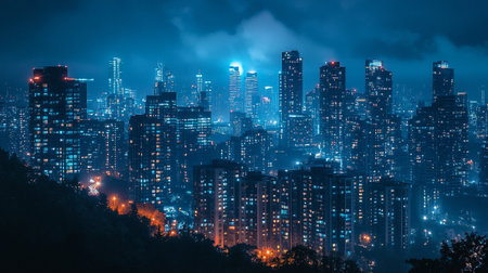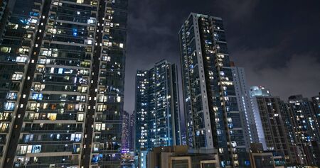 Cityscape of Hong Kong city at night with buildings and skyscrapers
