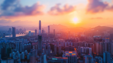 Sunset skyline over urban cityscape with high-rise buildings and distant mountains under golden sky