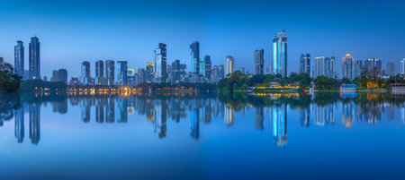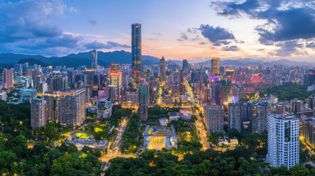Shenzhen, China - July 16, 2018: Shenzhen urban cityscape of new city modern downtown area at blue hour in Guangdong China