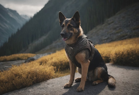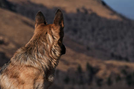German Shepherd traveler in mountains. Portrait of dog in closeup against background of a yellow autumn valley. Profile view reddish black shepherd in nature.