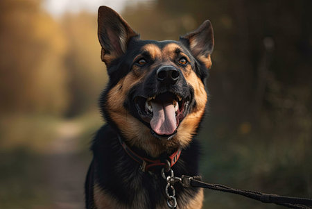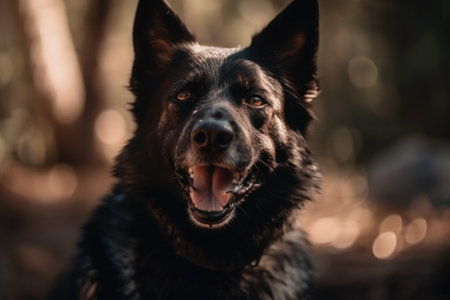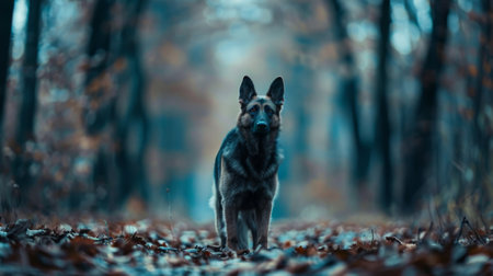 In the heart of the forest, a German shepherd dog showcases its carnivorous nature. Surrounded by natural beauty, the canines snout points to its Canidae family heritage