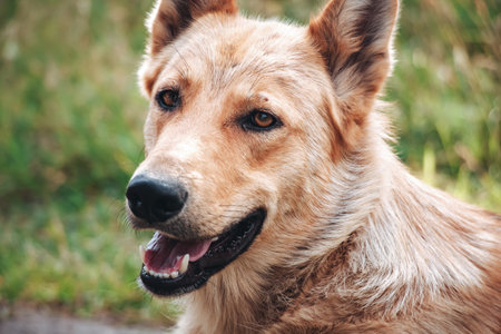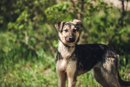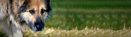 mongrel dog looks at the camera on a green blurred background. banne. animal protection