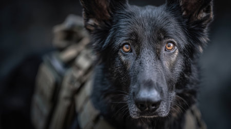 A striking close-up showcases a black German Shepherd dog, its intense eyes conveying alertness. The dog is seen against a blurred, dark background. The image has a professional quality, and the focus is on the animal's features. This image would be suitable for various commercial or editorial uses.