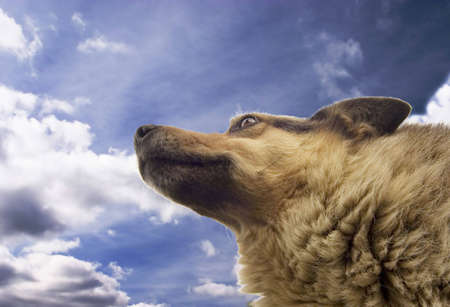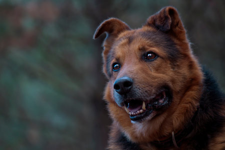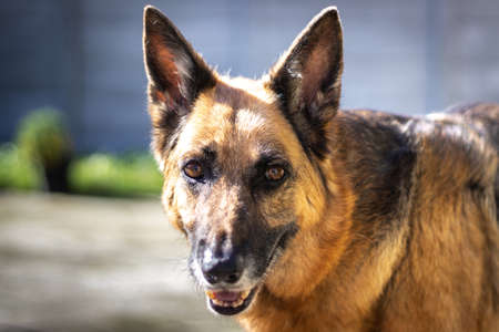 portrait of the face of a senior German Shepherd Dog. Smiling and attentive. pure look. obedience and love. space for copy. Dark tones.