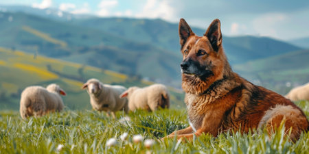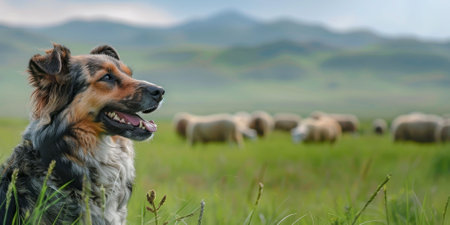 A herding dog watching over a flock of sheep in a green pasture, showcasing farm life and working animals. High quality photo