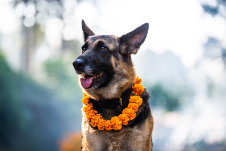 German shepherd with a marigold garland being worshiped during Kukur Tihar (dog Deepawali) in Kathmandu, Nepal