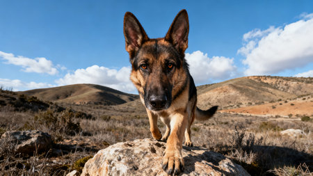 German shepherd dog on a rock in a sunny day. Selective focus.