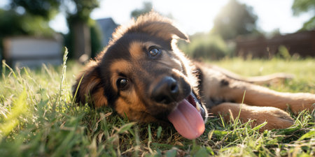 Happy dog lying on green grass in a backyard during sunny afternoon