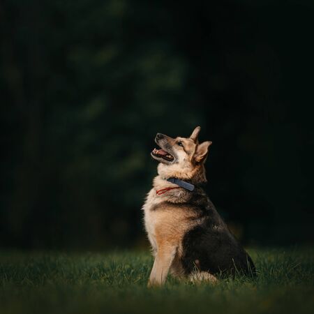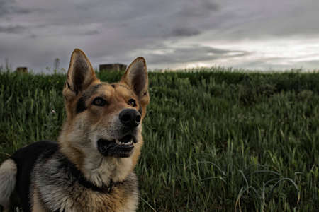 German Shepherd Dog outdoor portrait sitting in grass. Attentive Senior dog