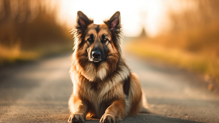 German Shepherd dog sitting on the road at sunset. selective focus.