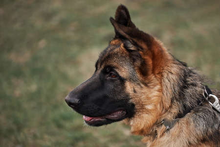 German Shepherd puppy breeding show, close up portrait on background of green grass. Charming cute grown up shepherd puppy. High bred dog with protruding ears.