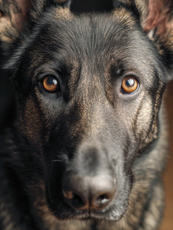 A captivating portrait highlighting a vigilant German Shepherd's piercing amber gaze and intricate fur patterns, illuminated by gentle natural light to reveal depth