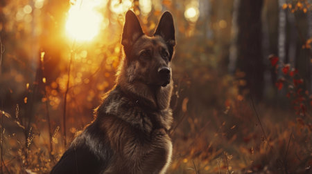 A German Shepherd rests in the serene woods, surrounded by trees, as the sun sets in the background, A loyal German Shepherd standing guard, Ai generated