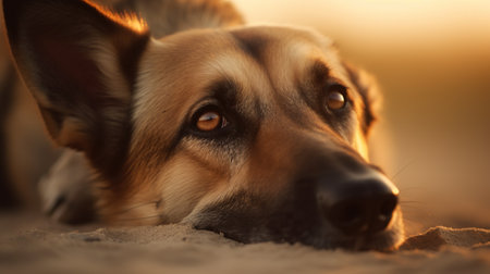 German shepherd dog lying on the sand at sunset. Selective focus.
