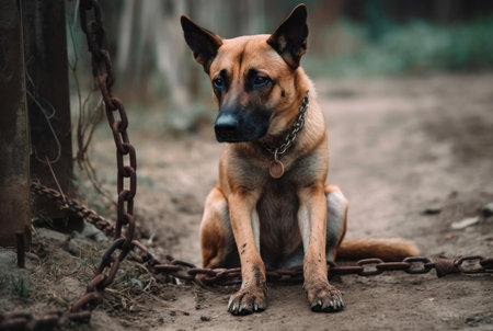 Abused dirty dog sitting outside. Abandoned puppy pet alone on street. Generate ai
