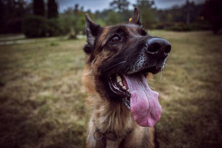 An elderly brown gray-haired dog of the Shepherd parody is waiting for a command with its tongue hanging out in the evening in the park