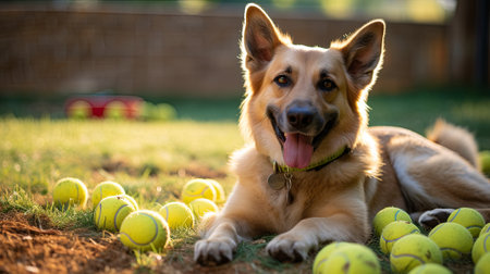 German shepherd dog plays in the garden with tennis ball, generated by AI. High quality photo