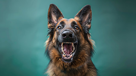 Belgian Tervuren, angry dog baring its teeth, studio lighting pastel background
